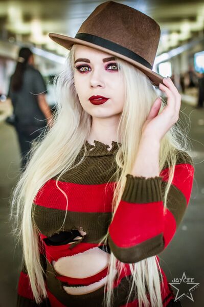 I woke up on Thursday, and was like fuck it, I don't feel like painting my face. We were suppose to go out that night for Chinh's birthday dinner, and I was done looking like a weirdo at nice restaurants. Freddy was pretty simple... I did some black/red eye makeup, straightened my hair and threw on the costume. Despite slacking on the makeup, I liked how it came out and the glove looks legit in photos for something that was really cheap. My favorite photos are from Steve, who was Chinh's wedding photographer. He does amazing photography and has some serious editing skills. I really hope I can do more shoots with him because my Freddy photos look beyond amazing. These photos are probably my favorite photos of the con. Jaycee and Brian Maze also got some pretty cool shots in too. I also love my last minute decision to buy those brown contacts. They really stand out in all the photos and enhance the cosplay in my opinion.